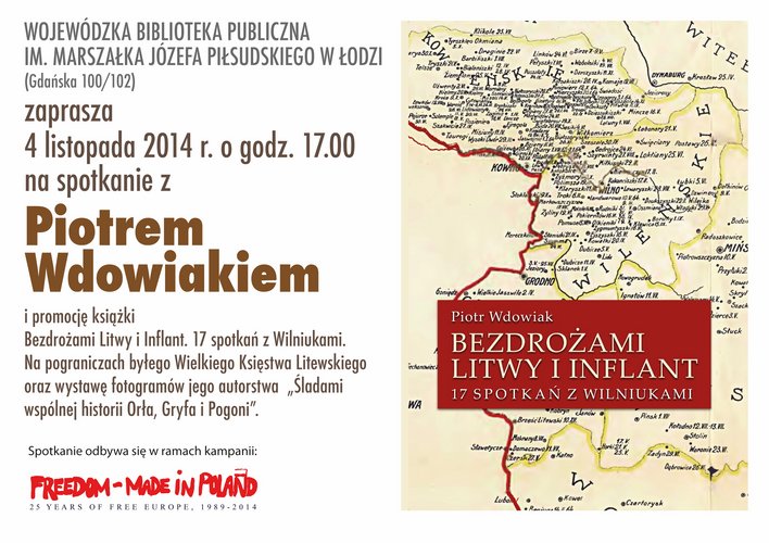 Wojewódzka Biblioteka Publiczna im. Marszałka Józefa Piłsudskiego w Łodzi zaprasza 4 listopada o godz. 17.00 na spotkanie z Piotrem Wdowiakiem i promocję jego książki „Bezdrożami Litwy i Inflant. 17 spotkań z Wilniukami. Na pograniczach byłego Wielkiego Księstwa Litewskiego”.