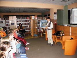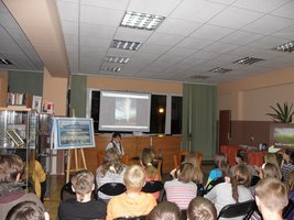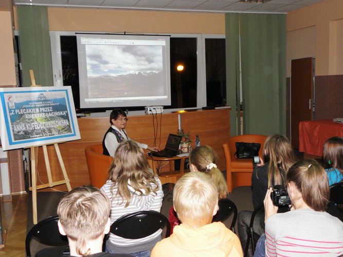 Podczas spotkania Pani Anna opowiadała o najdawniejszej historii Ameryki kulturze prekolumbijskiej i latynoamerykańskiej dzieliła się z nami wieloma ciekawymi spostrzeżeniami jakie poczyniła podróżując przez współczesną Amerykę Łacińską. Opowieść ilustrowana była pięknymi slajdami z podróży po omawianym kontynencie. Dodatkową atrakcją była wystawa pamiątek z podróży, na którą składały się wyroby rękodzielnicze.