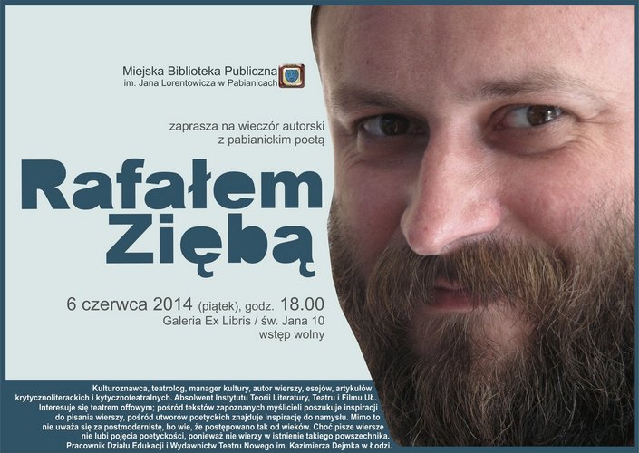 Miejska Bibiloteka Publiczna im. Jana Lorentowicza w Pabianicach zaprasza na spotkanie autorskie z pabianickim poetą Rafałem Ziębą, które odbędzie się 6 czerwca o godz. 18.00 w Galerii Ex Libris (Św. Jana 10 w Pabianiach). Wstęp wolny!