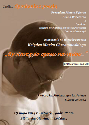 13 maja o godz. 17.00 w Miejsko Powiatowej Bibliotece Publicznej w Zgierzu odbędzie się wieczór z poezją Księdza Marka Chrzanowkiego „By starczyło czasu na miłość…”. Utwory ks. Marka zagra i zaśpiewa Łukasz Zawada.