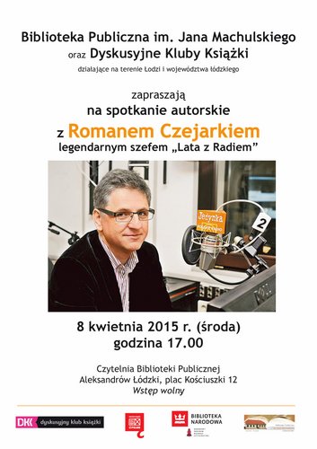 Biblioteka Publiczna im. Jana Machulskiego w Aleksandrowie Łódzkim oraz Dyskusyjne Kluby Książki zapraszają 8 kwietnia (środa) 2015 r. o godz. 17.00 na spotkanie z Romanem Czejarkiem, które odbędzie się w Czytelni Biblioteki Publicznej.