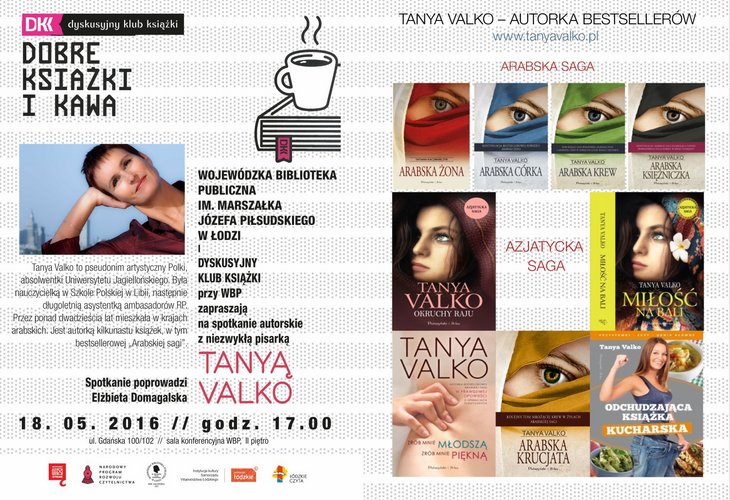 Wojewódzka Biblioteka Publiczna im. Marszałka Józefa Piłsudskiego w Łodzi i Dyskusyjny Klub Książki przy WBP zapraszają 18 maja 2016 r. o godz. 17.00 na spotkanie z pisarką Tanyą Valko.