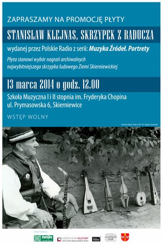 W czwartek, 13 marca o godz. 12:00 w Szkole Muzycznej I i II stopnia im. Fryderyka Chopina (przy ul. Prymasowskiej 6) w Skierniewicach odbędzie się promocja płyty Stanisław Klejnas, skrzypek z Raducza wydanej przez Polskie Radio. Płyta stanowi wybór nagrań archiwalnych najwybitniejszego skrzypka ludowego Ziemi Skierniewickiej. Wstęp wolny, zapraszamy.