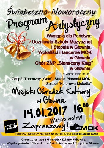 14 stycznia uczniowie Szkoły Muzycznej I Stopnia w Głownie, wokaliści i tancerze Miejskiego Ośrodka Kultury w Głownie oraz Chór ZNP "Słoneczny Krąg" zaprezentują Świąteczno-Noworoczny Program Artystyczny. Start: godz. 16.00. Wstęp wolny!