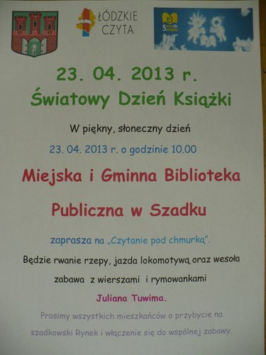 W dniu 23 kwietnia 2013 r. na szadkowskim Rynku obchodzony będzie Światowy Dzień Książki. Z tej okazji zapraszamy wszystkich do "Czytania pod chmurką", oraz wspólnej zabawy z wierszami i rymowankami Juliana Tuwima.
