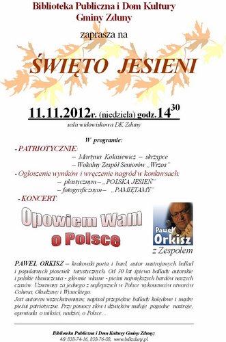 Biblioteka Publiczna i Dom Kultury Gminy Zduny zaprasza na coroczną imprezę pn. „Święto Jesieni”, która odbędzie się 11 listopada 2012 r. o godzinie 14.30 w sali widowiskowej Domu Kultury.