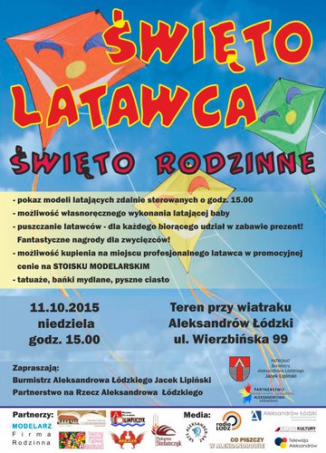 Partnerstwo na rzecz Aleksandrowa Łódzkiego zaprasza całe rodziny, wszystkich którzy lubią aktywnie spędzać czas na łonie natury. Zapowiada się wspaniała rodzinna zabawa. Wejściówką na imprezę jest własnoręcznie zbudowany latawiec. W tym roku jest szansa wykonać go pod okiem instruktora Pana Jerzego Klimaczaka (zgłoszenia pod nr tel. 516 649 340). Będzie też można na miejscu zrobić "latajacą babę" lub kupić gotowe latawce.