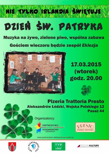 Aleksandrów Łódzki też przyłączył się do obchodów Dnia Św. Patryka! 17 marca o godz. 20.00 Partnerstwo Na Rzecz Aleksandrowa Łódzkiego oraz Pizzeria Trattoria Presto zapraszają do sali Presto w Aleksandrowie. Na uczestników czekać będą irlandzkie przekąski i muzyka na żywo. Wieczór uświetni występ zespołu Eklezja.