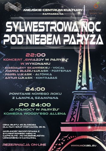 Miejskie Centrum Kultury w Bełchatowe zaprasza na „Sylwestrową noc pod niebem Paryża”. Ten wyjątkowy wieczór rozpocznie się o godzinie 22.00 koncertem „Gwiazdy w Paryżu” w wykonaniu: Magdaleny Skawińskiej, Joanny Błażej-Łukasik, Pawła Łukasika i Artura Łukasika. Podczas koncertu będzie można usłyszeć najpiękniejsze piosenki z repertuaru m.in. Edith Piaf, Marleny Dietrich i Hanki Ordonówny. Ale to nie koniec atrakcji. Cena biletu: 45 zł/os.