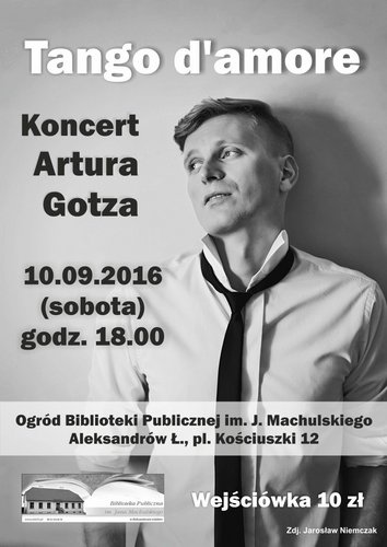 Biblioteka Publiczna im Jana Machulskiego 10 września o godz. 18.00 zaprasza na recital piosenki aktorskiej i kabaretowej „Tango d’amore” w wykonaniu charyzmatycznego aktora-wokalisty Artura Gotza. Artyście towarzyszyć będzie zespół w składzie: Dariusz Igielski, Michał Nowak i Kacper Kaźmierski. Wejściówka 10 zł. Koncert odbędzie się w Ogrodzie Biblioteki.