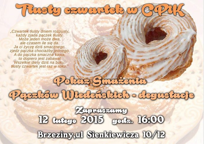 12 lutego o godz. 16.00 w Centrum Promocji i Kultury w Brzezinach odbędzie się pokaz smażenia pączków wiedeńskich przez Brzezińskie Koło Gospodyń Miejskich Babeczki Chili. Zapraszamy na degustację przy kawie! Udział w spotkaniu bezpłatny.