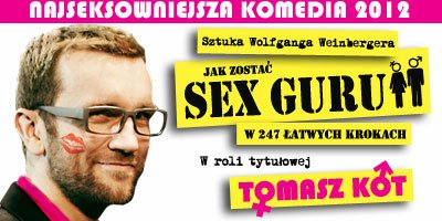 Tomasz Kot w przezabawnej komedii pt. "Jak zostać Sex Guru w 247 krokach" na scenie Kutnowskiego Domu Kultury 13 czerwca o godz.19.00. UWAGA - Ta sztuka może radykalnie zmienić Twoje życie miłosne! Przezabawna sztuka Wolfganga Weinbergera SEX-GURU, wielki przebój West Endu, w polskiej adaptacji w reżyserii Gabriela Gietzky’ego. W roli głównej - jeden z najsłynniejszych i najlepszych polskich aktorów – TOMASZ KOT, który zaskoczy Was tym, ile wie o Waszym seksie! Każdy z nas zastanawiał się kiedyś czy jest dobrym kochankiem/kochanką, choć nie każdy się do tego przyznaje. Niepewność w życiu seksualnym mają nawet najbardziej dobrane pary. Humor i śmiech pozwalają pozbyć się wszystkich wątpliwości raz na zawsze - zapewnia autor Wolfgang Weinberger. Nie spodziewajcie się jednak poważnego wykładu – Tomasz Kot wyleczy Was śmiechem! Zafunduje Wam prawdziwą seksualną apokalipsę. Jak zostać Sex Guru w 247 łatwych krokach to rozpustnie śmieszna interaktywna sztuka dla dorosłych, w której Tomasz Kot będzie naszym przewodnikiem po seksualnym labiryncie. Aktor w komediowy, pikantny, ale zdystansowany sposób przedstawi widzom wiele praktycznych porad i wskazówek jak urozmaicić ich życie erotyczne. Sex-Guru pomoże także odpowiedzieć na pytania, których wcześniej nie śmieliśmy zadać, a które od zawsze nurtowały ludzkość: Czego tak naprawdę pragną kobiety? Jak często powinienem/powinnam uprawiać seks? Czy mężczyźni naprawdę wiedzą gdzie jest słynny punkt „G”? Jeżeli jednak jesteś jednym z niewielu szczęśliwców, którzy nie mają problemów ze swoim życiem seksualnym – nie rezygnuj z dobrej zabawy – przyjdź i poznaj sekrety innych!