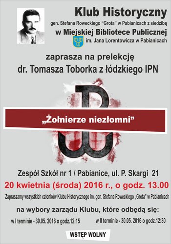 Klub Historyczny gen. Stefana Roweckiego „Grota” w Pabianicach z siedzibą w Miejskiej Bibliotece Publicznej im. Jana Lorentowicza w Pabianicach, zaprasza na prelekcję dr Tomasza Toborka pt. „Żołnierze niezłomni”. Spotkanie odbędzie się 20 kwietnia o godz. 13:00 w Zespole Szkół nr 1 w Pabianicach. Wstęp wolny!