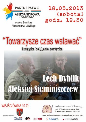 18 maja 2013 r.; godz.19.30 (sobota) Herbaciarnia Klimaty (ul.Warszawska 28); "Towarzysze czas wstawać" rosyjska ballada poetycka koncert Lecha Dyblika i Aleksieja Siemieniszczewa; wejściówka 10 zł.