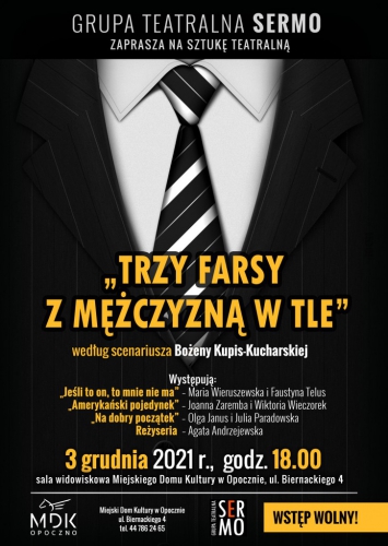 Grupa Teatralna SERMO, działająca przy Miejskim Domu Kultury w Opocznie, zaprasza na sztukę teatralną według scenariusza Bożeny Kupis-Kucharskiej pt. „Trzy farsy z mężczyzną w tle”, która odbędzie się 3 grudnia (piątek) o godz. 18.00 na sali widowiskowej MDK.