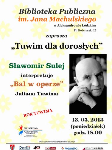 13 maja o godz. 18.00 w Czytelni Biblioteki Publicznej im. Jana Machulskiego w Aleksandrowie Łódzkim Sławomir Sulej, aktor teatralny, telewizyjny i filmowy, opowie o swojej pracy i pasji, a także zinterpretuje jeden z najbardziej kontrowersyjnych i mocnych utworów Juliana Tuwima "Bal w operze". Będzie to niezwykły pokaz umiejętności aktorskich artysty.