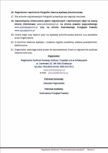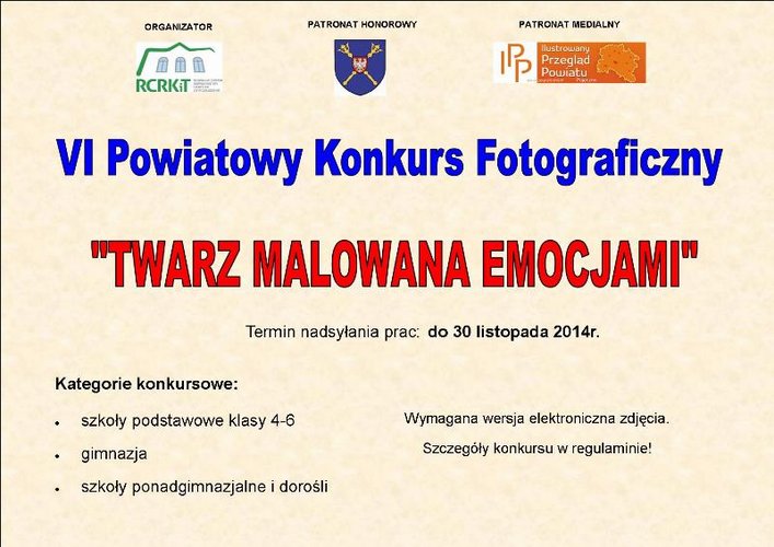 Regionalne Centrum Rozwoju Kultury i Turystyki w Działoszynie zaprasza dzieci, młodzież i dorosłych do wzięcia udziału w VI Powiatowym Konkursie Fotograficznym Powiatu Pajęczańskiego pt. „TWARZ MALOWANA EMOCJAMI” Termin nadsyłania fotografii upływa 30 listopada.