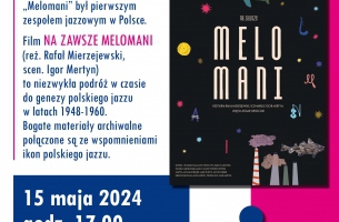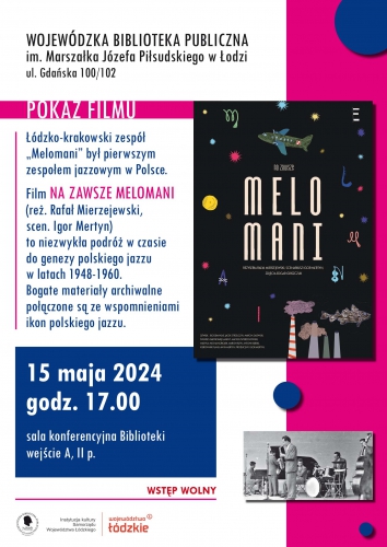 15 maja, godz. 17.00 – Pokaz filmu "Na zawsze Melomani" połączony z dyskusją dotyczącą środowiska łódzkich melomanów. Łódzko-krakowski zespół Melomani był pierwszym zespołem jazzowym w Polsce, powstał na przełomie 1949 i 1950 roku. Bogate materiały archiwalne połączone są ze wspomnieniami ikon polskiego jazzu: "Idona" Wojciechowskiego, Jana "Ptaszyna" Wróblewskiego, Wojciecha Karolaka, Michała Urbaniaka, czy Przemka Dyakowskiego. Szczegóły: https://www.wbp.lodz.pl/aktualnoci/spotkania-sesje/3636-2024-04-30-11-37-08.html