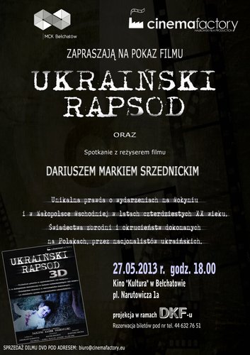 W tym roku mija 70 rocznica wydarzeń na Wołyniu. 27 maja o godzinie 18.00, w ramach Dyskusyjnego Klubu Filmowego w bełchatowskim Kinie „Kultura” odbędzie się projekcja filmu pt. "Ukraiński Rapsod" oraz spotkanie z jego autorem – Markiem Srzednickim, reżyserem, historykiem i dziennikarzem, który już gościł w naszym mieście na zaproszenie bełchatowskiego oddziału Polskiego Towarzystwa Historycznego. "Ukraiński Rapsod" to polski film fabularno-dokumentalny poświęcony tragicznym wydarzeniom z lat czterdziestych, zwanych "rzezią wołyńską". Jako jeden z pierwszych w kraju filmów tego typu został zrealizowany w technologii 3D. Przedstawia metody, jakimi posługiwali się członkowie Ukraińskiej Powstańczej Armii oraz współpracująca z nimi ludność w walce z Polakami na tym terenie. Prezentuje autentyczne świadectwa zbrodni i akty okrucieństwa dokonane na Polakach przez nacjonalistów ukraińskich. Wprowadza widza w niespotykany klimat, charakterystyczny dla atmosfery tamtych dni i trudny temat zbrodni UPA w Polsce. Współorganizatorem pokazu jest Muzeum Regionalne w Bełchatowie. Więcej informacji można znaleźć na stronie www.mckbel.eu.