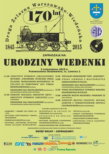 W imieniu Prezydenta Miasta Skierniewice pana Krzysztofa Jażdżyka, Stowarzyszenia Inżynierów i Techników Komunikacji oraz własnym mamy zaszczyt zaprosić na: „URODZINY WIEDENKI”, które odbędą się w Parowozowni Skierniewice w dniu 3 października 2015 r. w godz. 11.00-17.00.