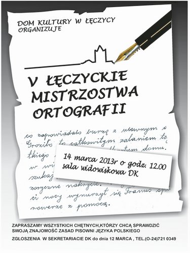 Zapraszamy mieszkańców Łęczycy i Powiatu Łęczyckiego do sprawdzenia swojej znajomości polskiej ortografii. Nagroda i Medal Mistrza Ortografii 2013 czekają! Konkurs odbędzie się 14 marca o godz. 12.00 w sali widowiskowej Domu Kultury w Łęczycy. Czekamy na zgłoszenia do 12 marca!