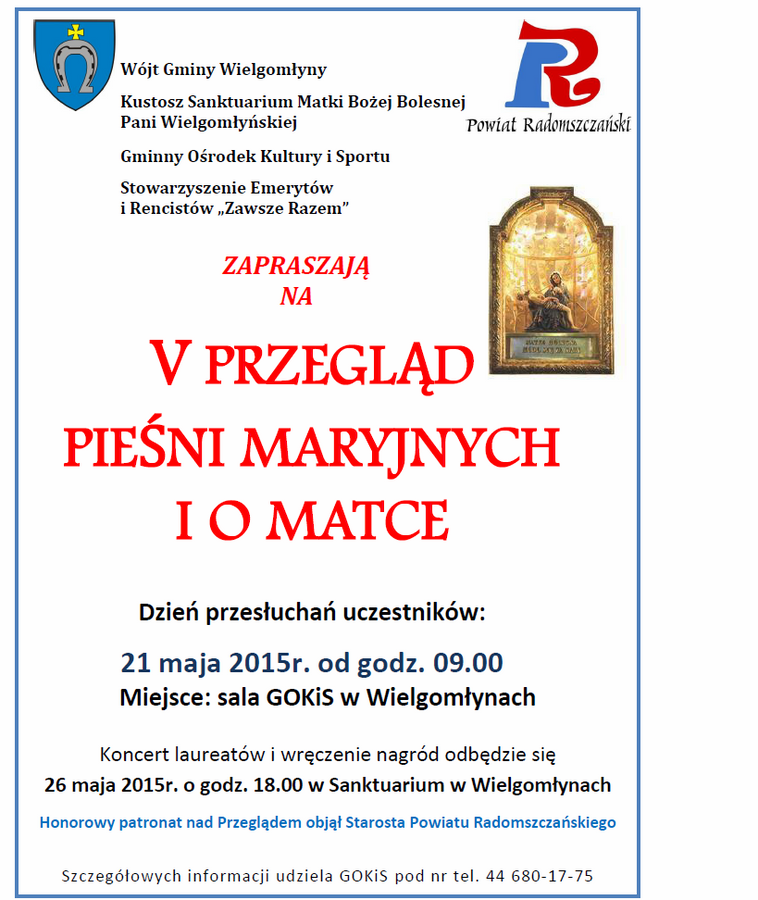 Wójt Gminy Wielgomłyny, Kustosz Sanktuarium Matki Bożej Bolesnej Pani Wielgomłyńskiej, Gminny Ośrodek Kultury i Sportu w Wielgomłynach Stowarzyszenie Emerytów i Rencistów "Zawsze Razem" z Wielgomłyn serdecznie zapraszają wszystkich chętnych do wysłuchania uczestników V Przeglądu Pieśni Maryjnych i o Matce - WIELGOMŁYNY 2015.