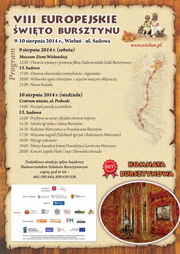 Gmina Wieluń oraz Wieluński Dom Kultury zapraszają na VIII Europejskie Święto Bursztynu. W programie tradycyjnie już wyścigi rydwanów, prezentacje legionów rzymskich oraz Rodzinne Mistrzostwa w Poszukiwaniu Bursztynu. Nowością będą pokazy rzemiosł historycznych i kramy rzemieślników oraz największa atrakcja tegorocznej edycji Komnata Bursztynowa.