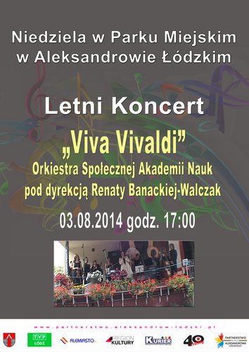 Partnerstwo na rzecz Aleksandrowa zaprasza na kolejne niedzielne, muzyczne spotkanie w Parku Miejskim w Aleksandrowie (pl. Kościuszki) 3.08.2014 o godz. 17.00. Tym razem usłyszymy orkiestrę kameralną Społecznej Akademii Nauk.W programie zostaną zaprezentowane: Andante Antonio Vivaldiego z Koncertu G-dur na 2 gitary z towarzyszeniem orkiestry oraz III Koncert Es-dur KV 447 na róg i orkiestrę W. Amadeusza Mozarta.Solistami będą Ireneusz i Eryk Walczak- gitary, Ireneusz Walczak- róg. Orkiestrą kameralną Społecznej Akademii Nauk w Łodzi dyryguje Renata Banacka-Walczak .