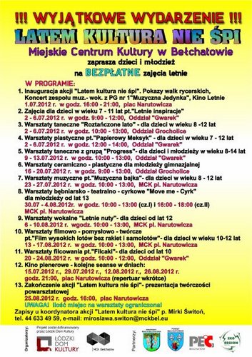 UWAGA: Ilość miejsc ograniczona! Zapisy u koordynatora akcji „Latem kultura nie śpi” p. Mirki Świtoń, tel.: 44 633 49 59, email: miroslawa.switon@mckbel.eu