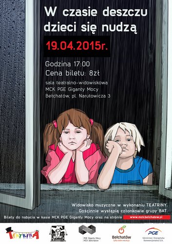 Bełchatowskie Miejskie Centrum Kultury zaprasza na spektakl w wykonaniu TEATRINY, z gościnnym udziałem osób śpiewających z grupy teatralnej BAT. Widowisko muzyczne "W czasie deszczu dzieci się nudzą" jest kolażem znanych, wspaniałych piosenek sprzed lat. Podczas widowiska będzie można usłyszeć takie przeboje jak: "Na pierwszy znak", "Miłość ci wszystko wybaczy" czy "Ach, jak przyjemnie". Chociaż te niezapomniane utwory będą śpiewane przez dzieci, to spektakl "W czasie deszczu dzieci się nudzą" jest przeznaczony nie tylko dla najmłodszych! Każdy widz, niezależnie od wieku, z pewnością usłyszy znajome melodie, dzięki którym chociaż na chwilę przeniesie się w zaczarowany świat piosenki!