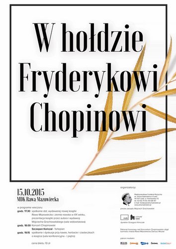 15 października w Miejskim Domu Kultury w Rawie Mazowieckiej odbędzie się wydarzenie pod hasłem "W hołdzie Fryderykowi Chopinowi". W programie: godz. 17.30 - spotkanie dot. nowej książki "Rawa Mazowiecka i ziemia rawska w XX wieku", godz. 18.00 - Koncert Chopinowski, 19.15 - spotkanie i dyskusja. Wstęp: 10 zł.