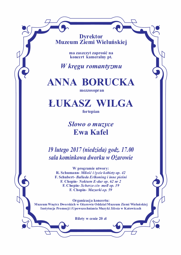 19 lutego o godz. 17.00 Muzeum Ziemi Wieluńskiej zaprasza na koncert kameralny "W kręgu romantyzmu", który odbędzie się w zabytkowym dworku w Ożarowie. Wystąpią: Anna Borucka (mezzosopran), Łukasz Wilga (fortepian). Słowo o muzyce: Ewa Kafel.