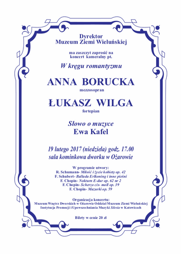 19 lutego o godz. 17.00 Muzeum Ziemi Wieluńskiej zaprasza na koncert kameralny pt. "W kręgu romantyzmu", który odbędzie się w zabytkowym dworku w Ożarowie.