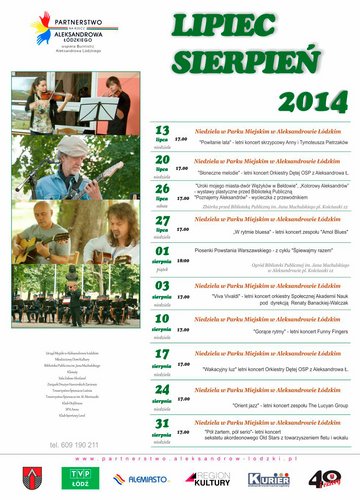 Partnerstwo na rzecz Aleksandrowa Łódzkiego zachęca do spędzania letnich popołudni w Parku Miejskim w Aleksandrowie. Czeka tu na wszystkich wiele atrakcji: plac zabaw dla dzieci, siłownia na powietrzu, a dla miłośników muzyki w każde niedzielne popołudnie od 13 lipca 2014 o godz. 17.00 odbywać się będzie koncert. Wstęp wolny!
