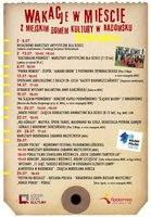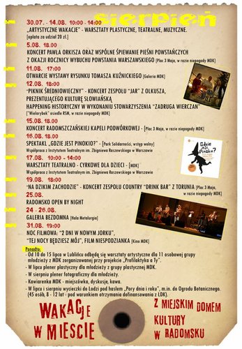 - 30.07 – 14.08 godz. 10:00 – 14:00 – „Artystyczne wakacje” – warsztaty plastyczne, teatralne, muzyczne (opłata za udział 20zł)