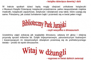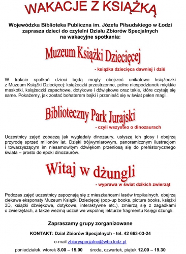 Dział Zbiorów Specjalnych Wojewódzkiej Biblioteki Publicznej im. Marszałka J. Piłsudskiego w Łodzi przygotował wakacyjną ofertę specjalną dla najmłodszych. W jej ramach grupy zorganizowane mają możliwość uczestniczyć w trzech różnych spotkaniach, podczas których poznają różne nietypowe formy i rodzaje książek oraz zagłębią temat dinozaurów i dzikich zwierząt.