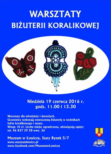 Muzeum w Łowiczu zaprasza na warsztaty biżuterii koralikowej. Zajęcia odbędą się w niedzielę 19 czerwca 2016 o godz. 11.00 i 13.30. Koszt zajęć 10 zł/os. Warsztaty przeznaczone są dla młodzieży i osób dorosłych. Liczba miejsc ograniczona - obowiązują zapisy.: tel. 46 837 39 28 wew. 36