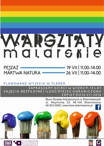 Biuro Wystaw Artystycznych w Skierniewicach zaprasza dzieci w wieku 9-15 lat na bezpłatne wakacyjne warsztaty malarskie. 19 lipca odbędą się zajęcia "PEJZAŻ" (planowane wyjście w plener do Parku Miejskiego; godz. 11.00 – 14.00), a 26 lipca "MARTWA NATURA" (sala 107 CKiS; godz. 11.00 – 14.00). Ilość miejsc ograniczona! Zapisy trwają!