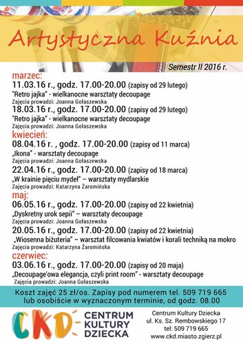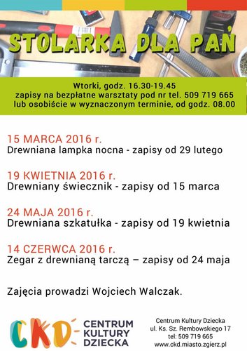 Centrum Kultury Dziecka w Zgierzu przygotowało bogatą ofertę zajęć i warsztatów na drugą część roku szkolnego. Warte uwagi są zupełnie nowe zajęcia stolarskie dla pań, które powstały dzięki dofinansowaniu mini warsztatu stolarskiego z I Zgierskiego Budżetu Obywatelskiego.