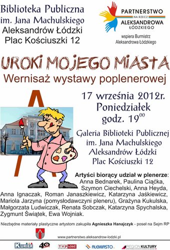 17.09.2012. godz.19.00 zapraszamy na wernisaż wystawy "Uroki mojego miasta", który odbędzie się w Galerii Biblioteki Publicznej im.Jana Machulskiego w Aleksandrowie Łódzkim (pl. Kościuszki 12). Wystawa jest efektem wakacyjnego pleneru plastycznego jaki zorganizowało Partnerstwo na rzecz Aleksandrowa.