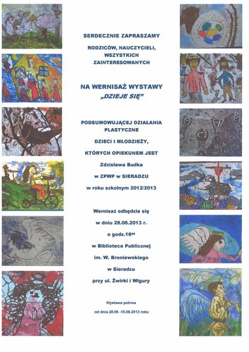 Powiatowa Biblioteka Publiczna oraz Zespół Placówek Wychowania Pozaszkolnego w Sieradzu zapraszają na wernisaż wystawy "Dzieje się" podsumowującej działania plastyczne dzieci i młodzieży, których opiekunem jest Zdzisława Budka w ZPWP. Prace powstały w roku szkolnym 2012/2013. Wernisaż odbędzie się 28 czerwca 2013 r. o godz. 16.00 w Powiatowej Bibliotece Publicznej w Sieradzu (ul. Żwirki i Wigury 4). Wystawa będzie prezentowana od 28 czerwca do 15 sierpnia 2013 r.