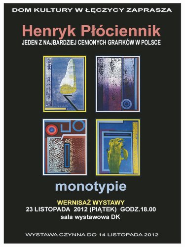 23 listopada o godz. 18.00 Dom Kultury w Łęczycy zaprasza na wernisaż wystawy pt. "Monotypie", na której zaprezentowane zostaną prace Henryka Płóciennika - jednego z najwybitniejszych i najwyżej cenionych grafików w Polsce.