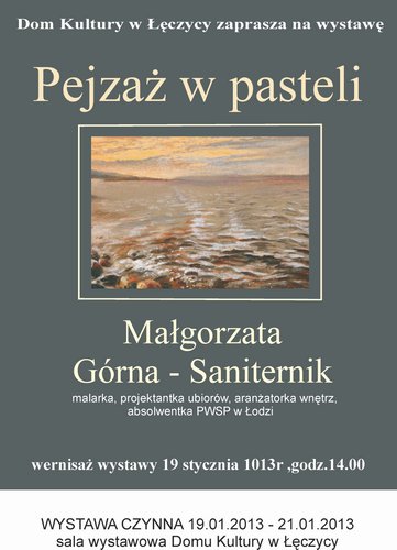 Dom Kultury w Łęczycy zaprasza 19 stycznia 2013 o godzinie 14.00 na wernisaż wystawy malarskiej 'PEJZAŻ W PASTELI" Małgorzaty Górnej-Saniternik, absolwentki PWSP w Łodzi zajmującej się malarstwem, kolażem, tkaniną unikatową, ubiorem a nawet aranżacją wnętrz.