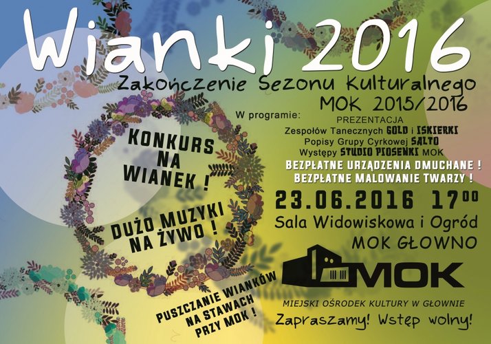 Miejski Ośrodek Kultury w Głownie 23 czerwca zaprasza na wydarzenie związane z obchodami Nocy Świętojańskiej połączone z zakończeniem roku kulturalnego 2015/2016 w MOK. W programie: muzyka na żywo, konkurs na wianek, puszczanie wianków na wodzie i wiele innych atrakcji!