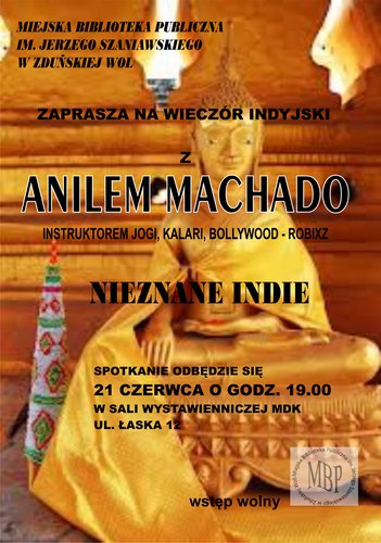 Miejska Biblioteka Publiczna im. Jerzego Szaniawskiego w Zduńskiej Woli zaprasza na wieczór indyjski z Anilem Machado, instruktorem jogi, kalari i Bollywood-Robixz, który opowie o niezwykle barwnym świecie Indii. Spotkanie pod hasłem "Nieznane Indie", odbędzie się 21 czerwca o godz. 19.00 w sali wystawienniczej Miejskiego Domu Kultury w Zduńskiej Woli.