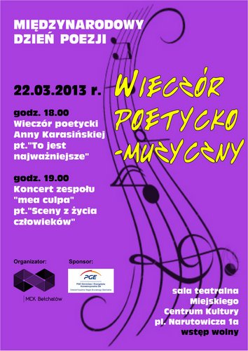 Z okazji Światowego Dnia Poezji Miejskie Centrum Kultury w Bełchatowie zaprasza 22 marca 2013 r. na niecodzienny, owiany nutką melancholii „Wieczór Poetycko – Muzyczny”. To wszystko za sprawą bełchatowskich miłośników poezji i muzyki: Anny Karsińskiej i grupy „mea culpa”.