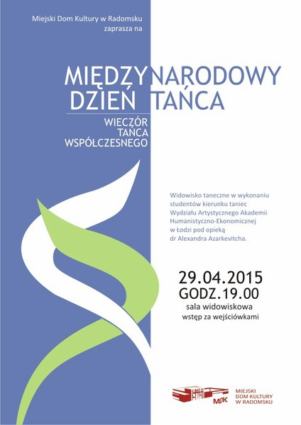 29 kwietnia 2015 r. o godz. 19.00 zapraszamy do Miejskiego Domu Kultury w Radomsku na widowisko taneczne w wykonaniu studentów kierunku taniec Wydziału Artystycznego Akademii Humanistyczno-Ekonomicznej w Łodzi. Koncert odbędzie się z okazji Międzynarodowego Dnia Tańca. Opieka artystyczna nad koncertem dr Alexandr Azarkevitch. Wejściówki na koncert do odbioru w kasie MDK.