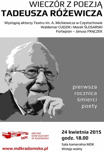 24 kwietnia mija pierwsza rocznica śmierci Tadeusza Różewicza. Tego dnia o godz. 18.00 Miejski Dom Kultury w Radomsku zaprasza na Wieczór z poezją Tadeusza Różewicza. Utwory poety czytać będą aktorzy Teatru im. A. Mickiewicza w Częstochowie - Waldemar Cudzik i Marek Ślosarski, przy akompaniamencie Janusza Frączka (fortepian). Wstęp wolny!
