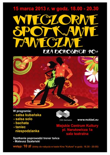 15 marca w godz. 18-20.30 Miejskie Centrum Kultury w Bełchatowie po raz kolejny zaprasza miłośników tańca na WIECZORNE SPOTKANIE TANECZNE 40 +. W programie przewidziano kontynuację poznanych na poprzednich spotkaniach stylów tanecznych oraz zapoznanie się z nowymi technikami tanecznymi. Spotkanie poprowadzi trener tańca Mateusz Szałański.