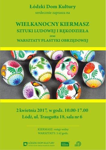 W niedzielę 2 kwietnia br. w Sali Kolumnowej ŁDK w godzinach 10.00-17.00 odbędzie się Wielkanocny Kiermasz Sztuki Ludowej i Rękodzieła. Zapraszamy również na Warsztaty Plastyki Obrzędowej.